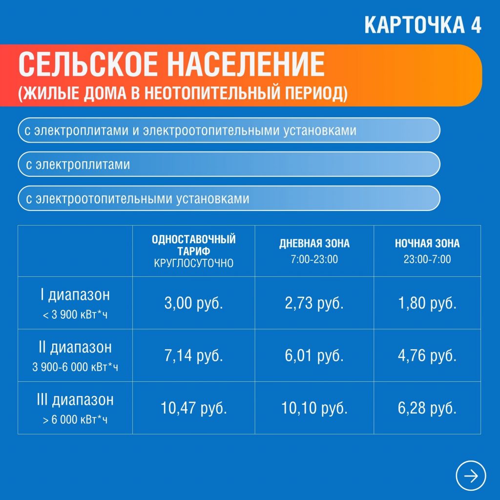 Так, например, для жителей сельских поселений, проживающих в многоквартирных домах и в жилых домах, оборудованных электроплитами и электроотопительными установками, либо только электроотопительными установками, с 1 января 2026 года одноставочный тариф для I диапазона объемов потребления электрической энергии составляет 3 руб./ кВт*ч, для II диапазона – 7,14 руб./ кВт*ч, для III диапазона – 10,47 руб./ кВт*ч.